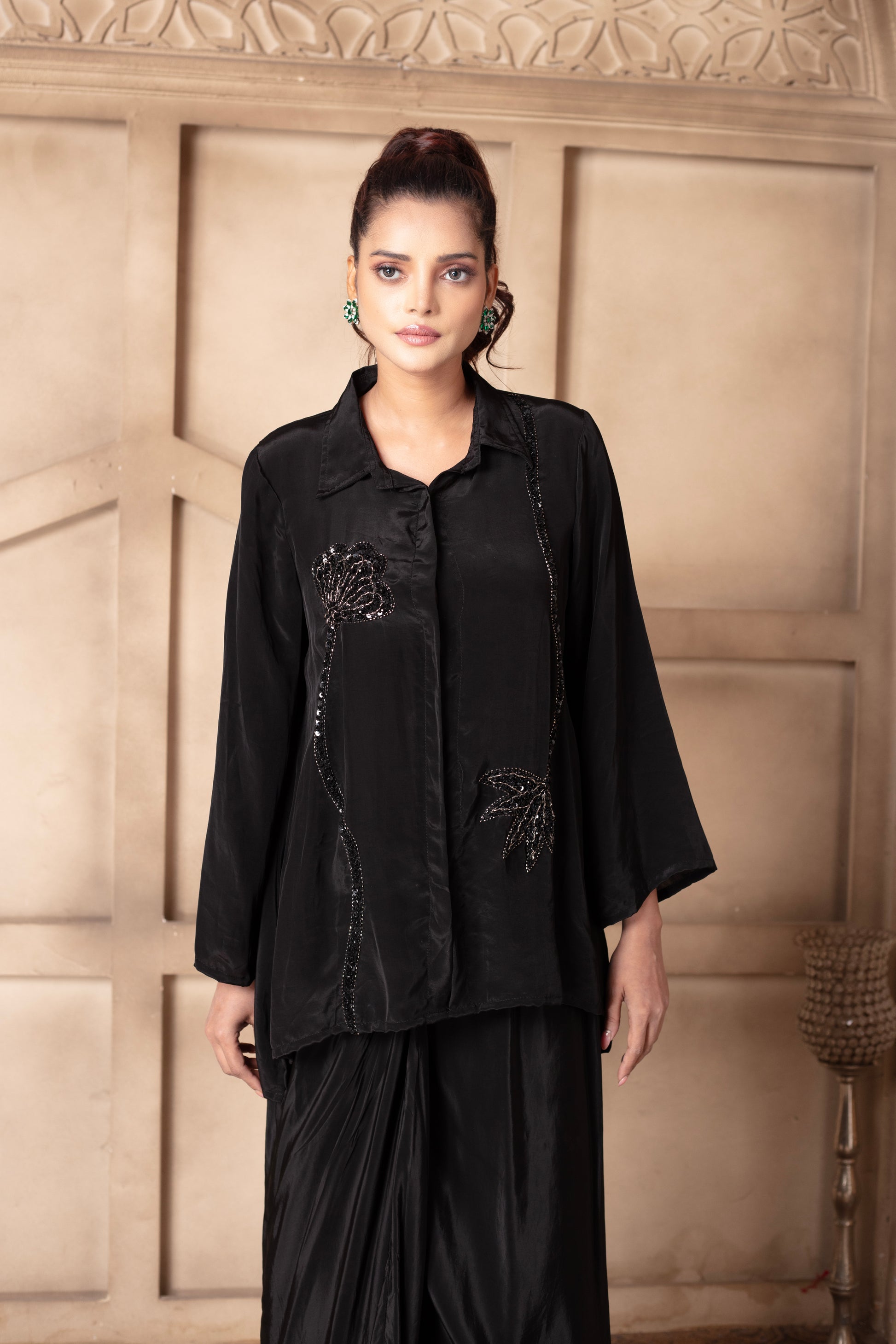 Our black draped skirt set consists of a shirt with an intricate tonal floral embroidery detail on the shirt, paired with a draped skirt. The fabric is crepe which makes the entire outfit extremely body friendly. Additionally making it comfortable and breathable.
