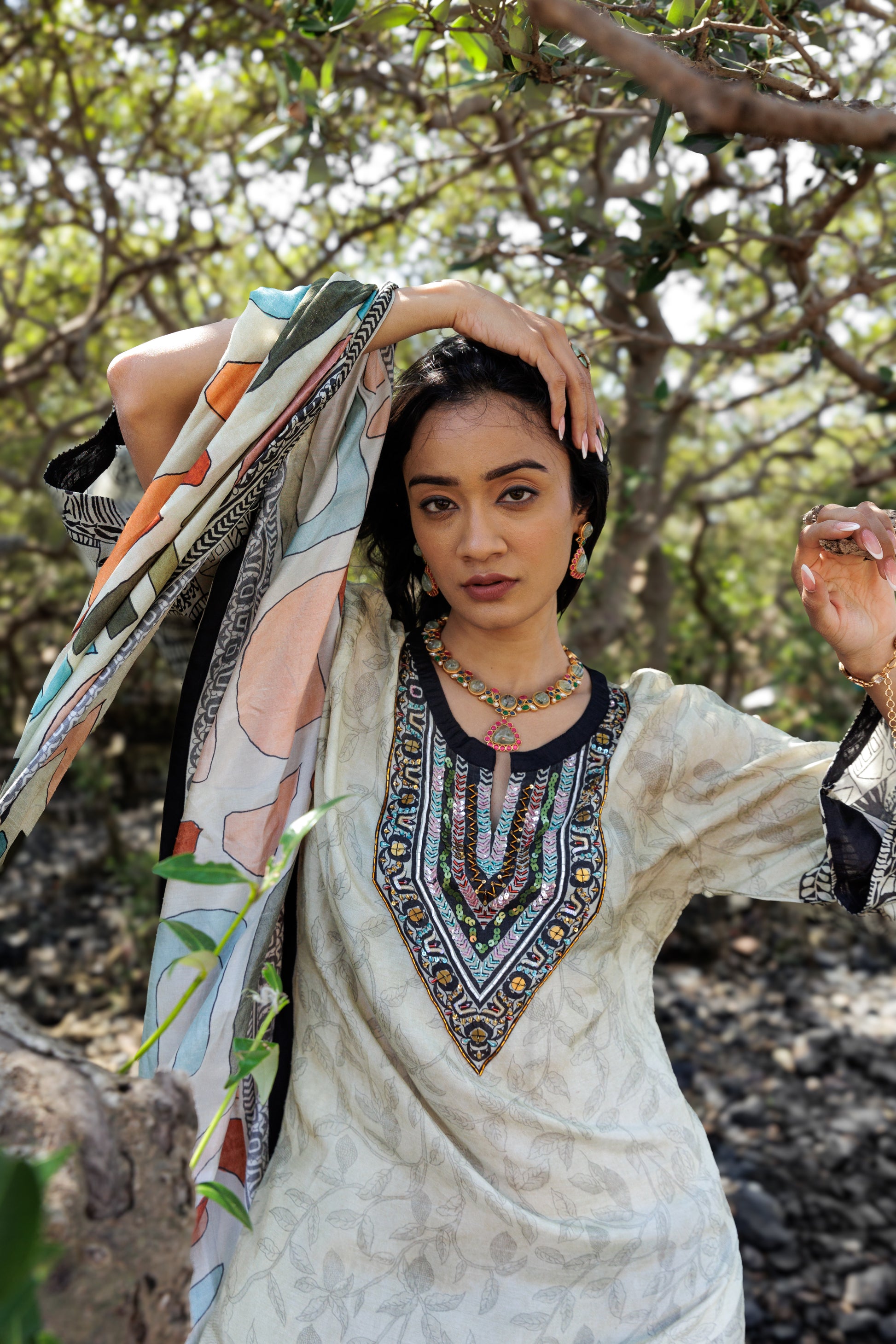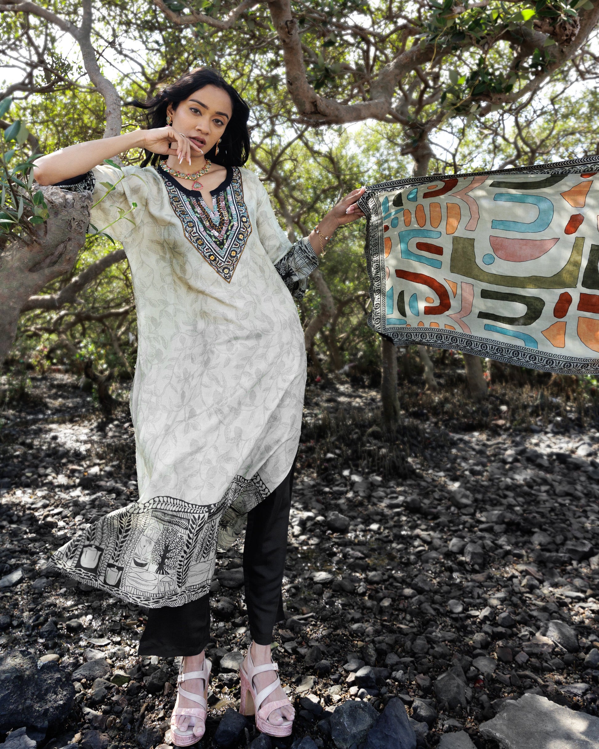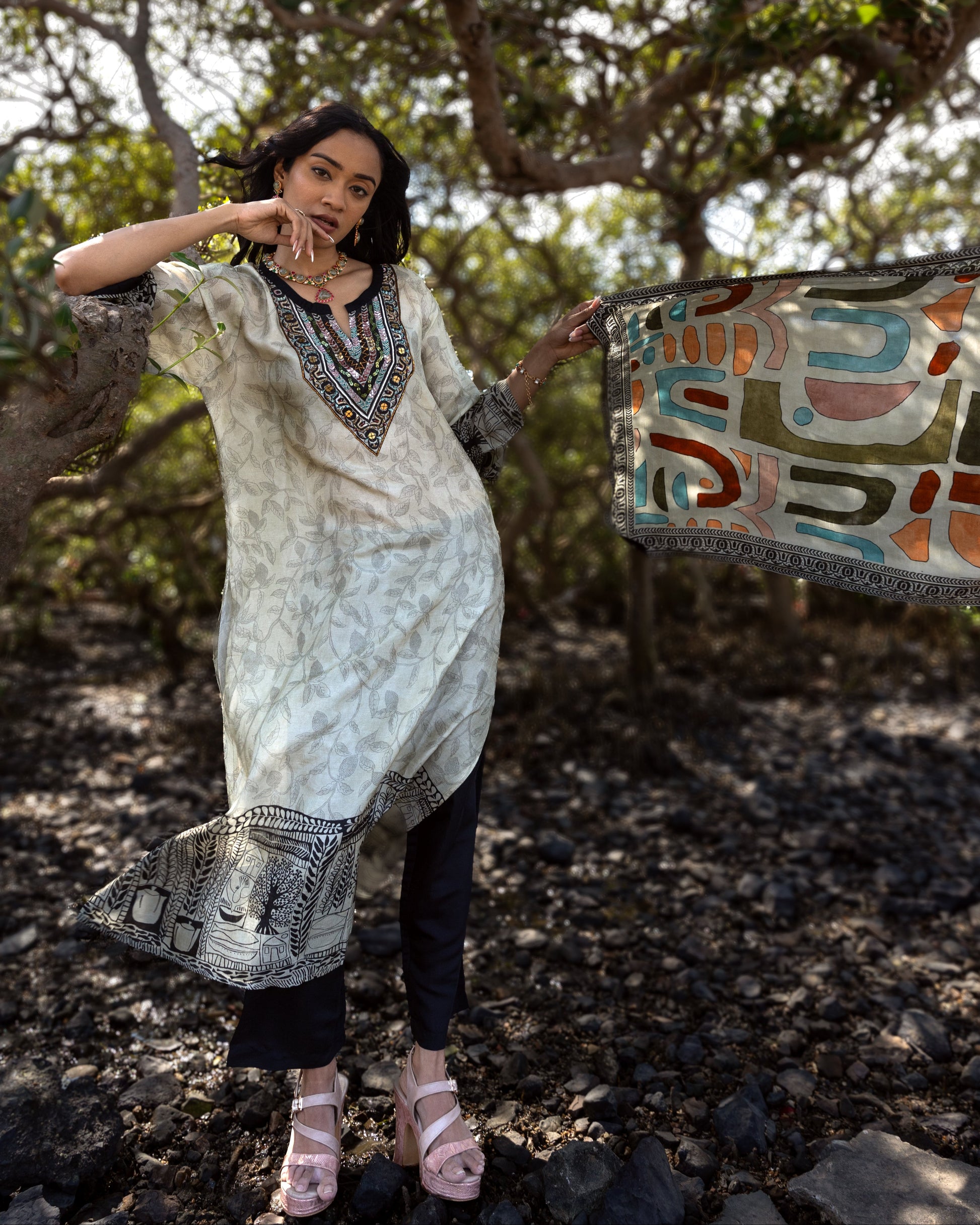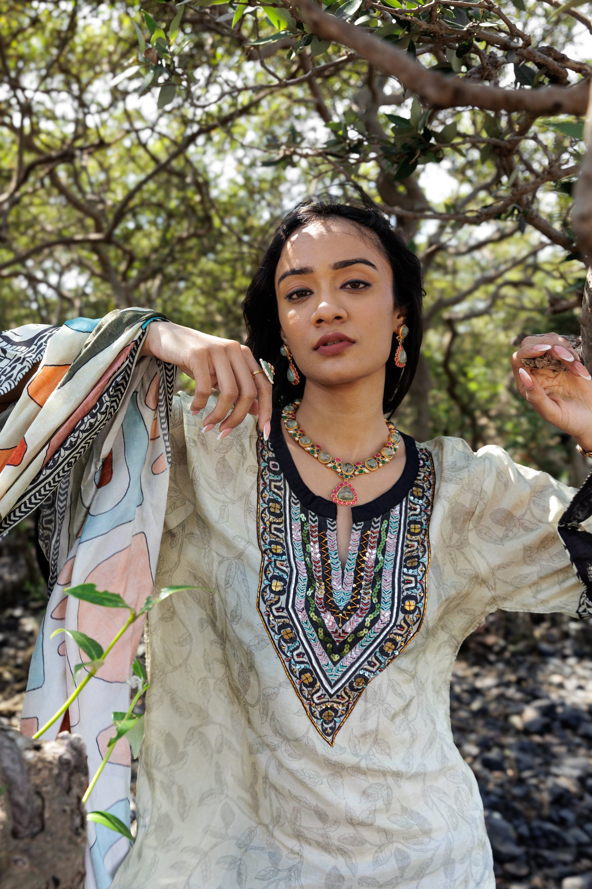 Our printed kurti set consists of a silk printed kurti with hand embroidery detailing on the yolk paired with a printed dupatta and cotton silk pants. The fabric is dola silk which makes the entire outfit extremely body friendly. . Additionally making it comfortable and breathable.