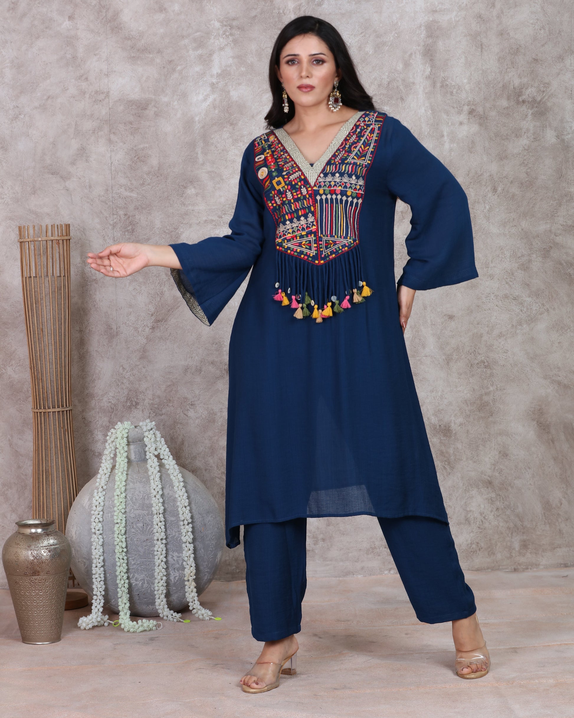 Our cotton A line kurti set consists of the v neck kurti, inner slip and pants. The kurti has a colourful machine embroidered yolk with beautiful tassel detailing. The fabric is a cotton base and has a crushed effect to it. It is extremely body friendly, comfortable and breathable.
