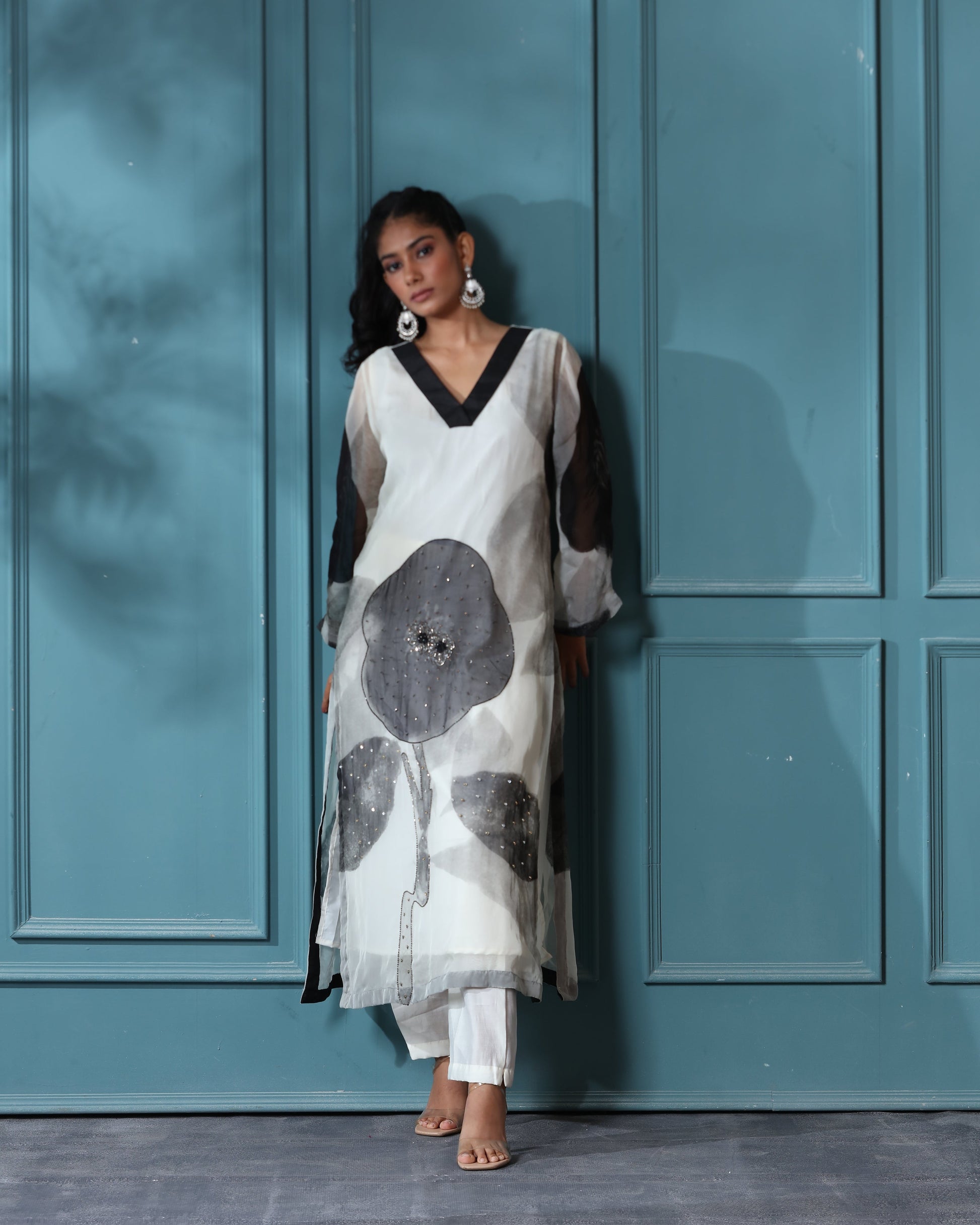 Our off white floral kurti set consists of a printed kurti with antique hand embroidery detailing paired with cotton silk pants. The fabric is organza which makes the entire outfit very elegant. . .