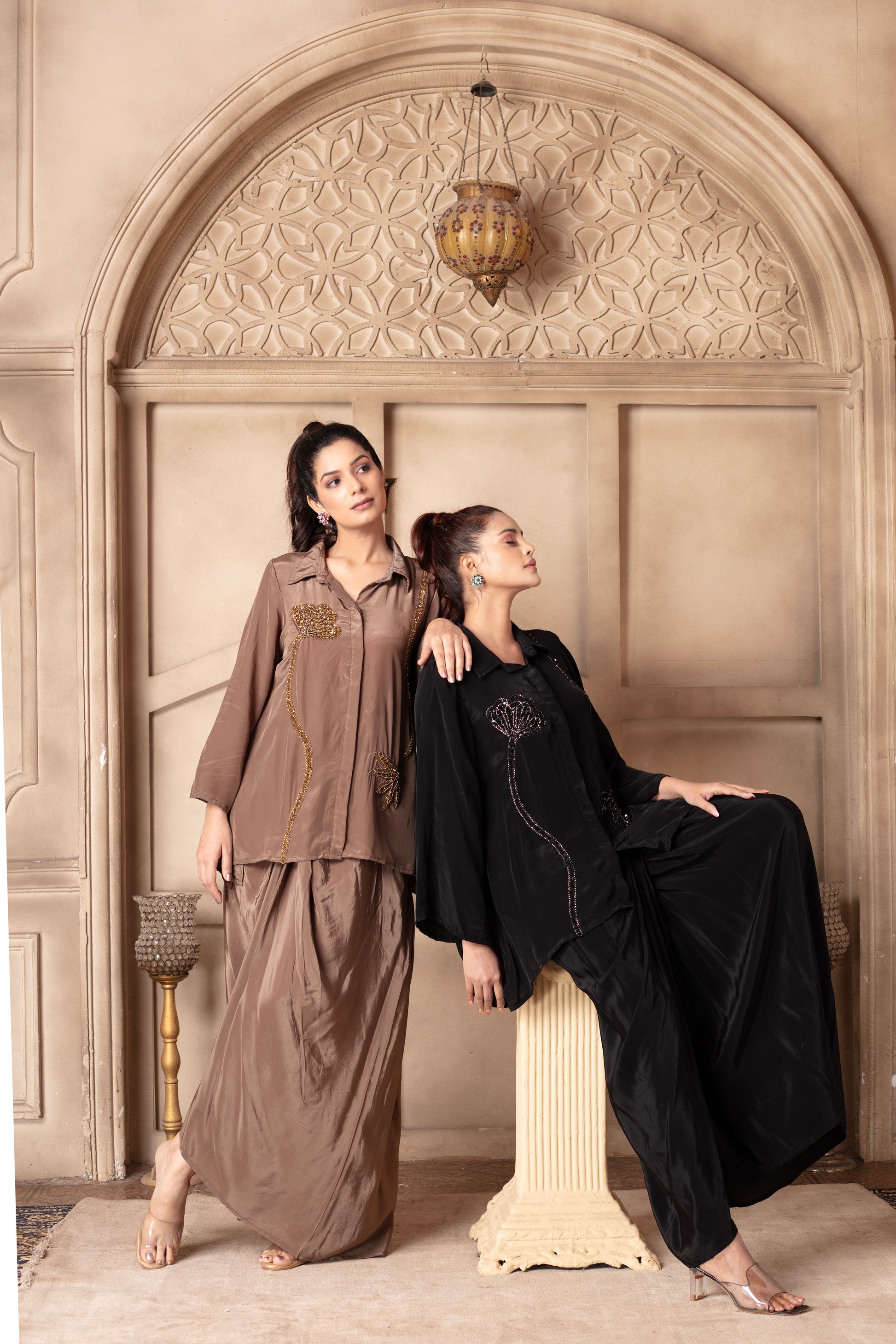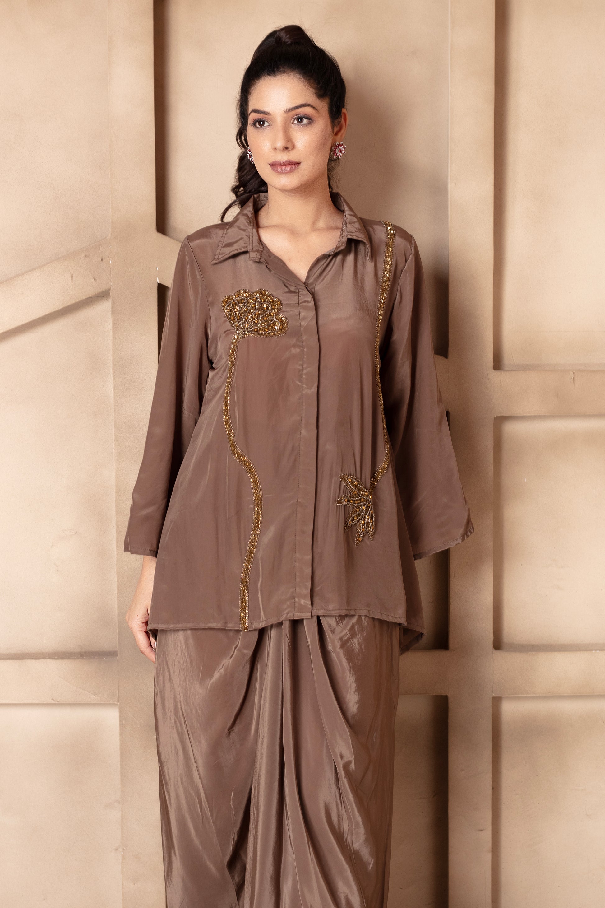 Our taupe draped skirt set consists of a shirt with an intricate tonal floral embroidery detail on the shirt, paired with a draped skirt. The fabric is crepe which makes the entire outfit extremely body friendly. Additionally making it comfortable and breathable.