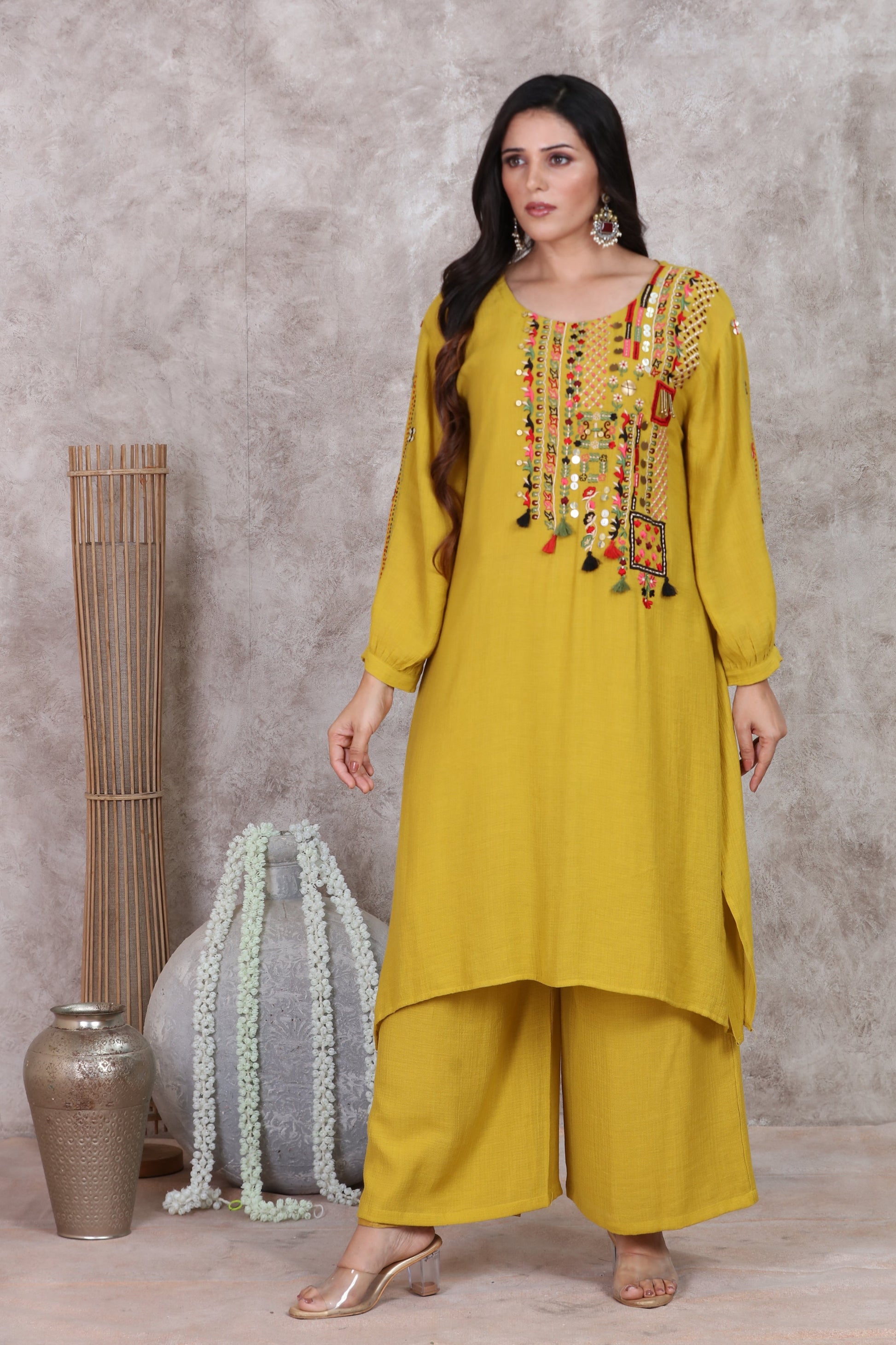 Our cotton A line kurti set consists of the round neck kurti, inner slip and pants. The kurti has a colourful machine embroidered yolk with beautiful tassel detailing. The fabric is a cotton base and has a crushed effect to it. It is extremely body friendly, comfortable and breathable.