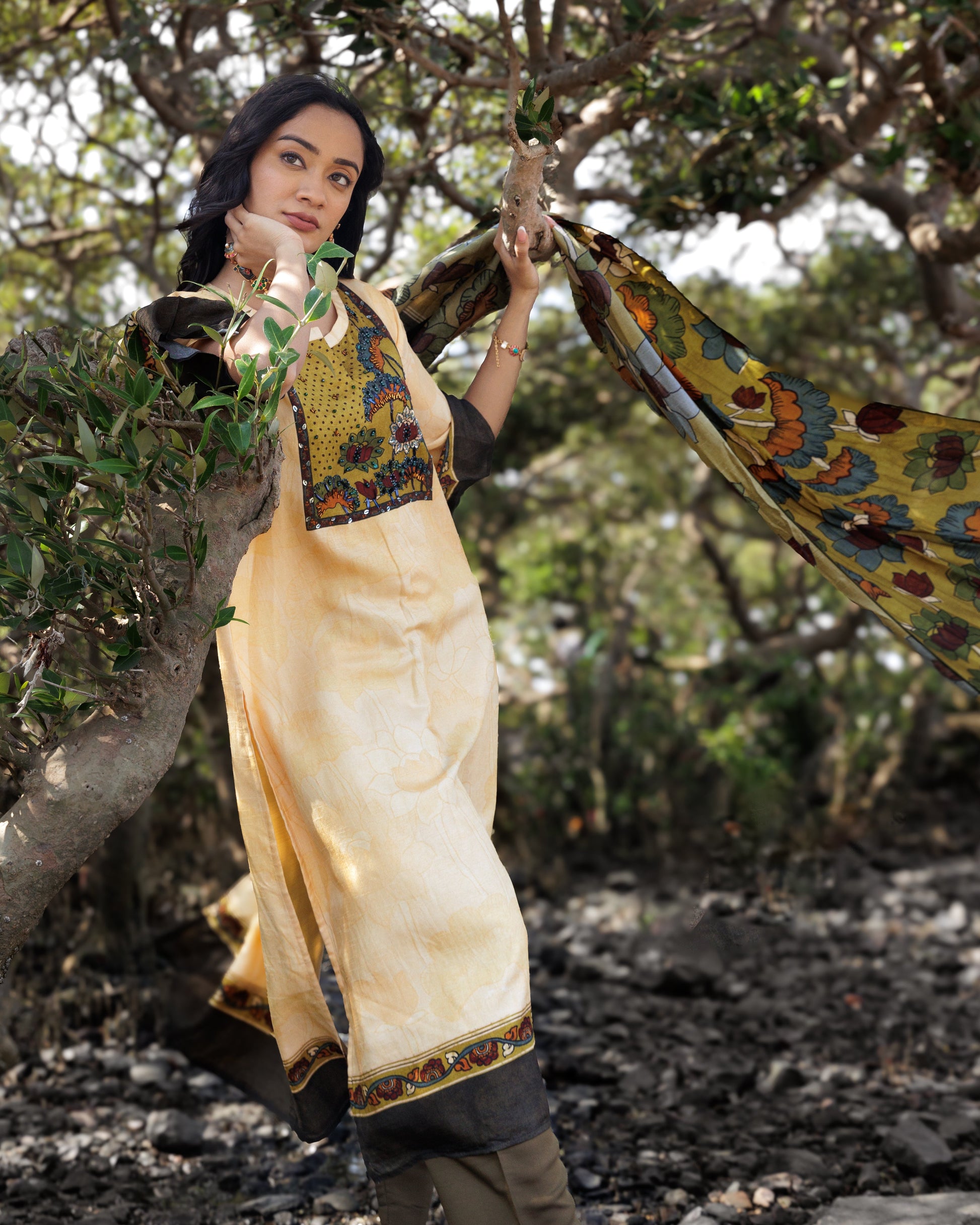 Our printed kurti set consists of a silk printed kurti with hand embroidery detailing on the yolk paired with a printed dupatta and cotton silk pants. The fabric is dola silk which makes the entire outfit extremely body friendly. . Additionally making it comfortable and breathable.
